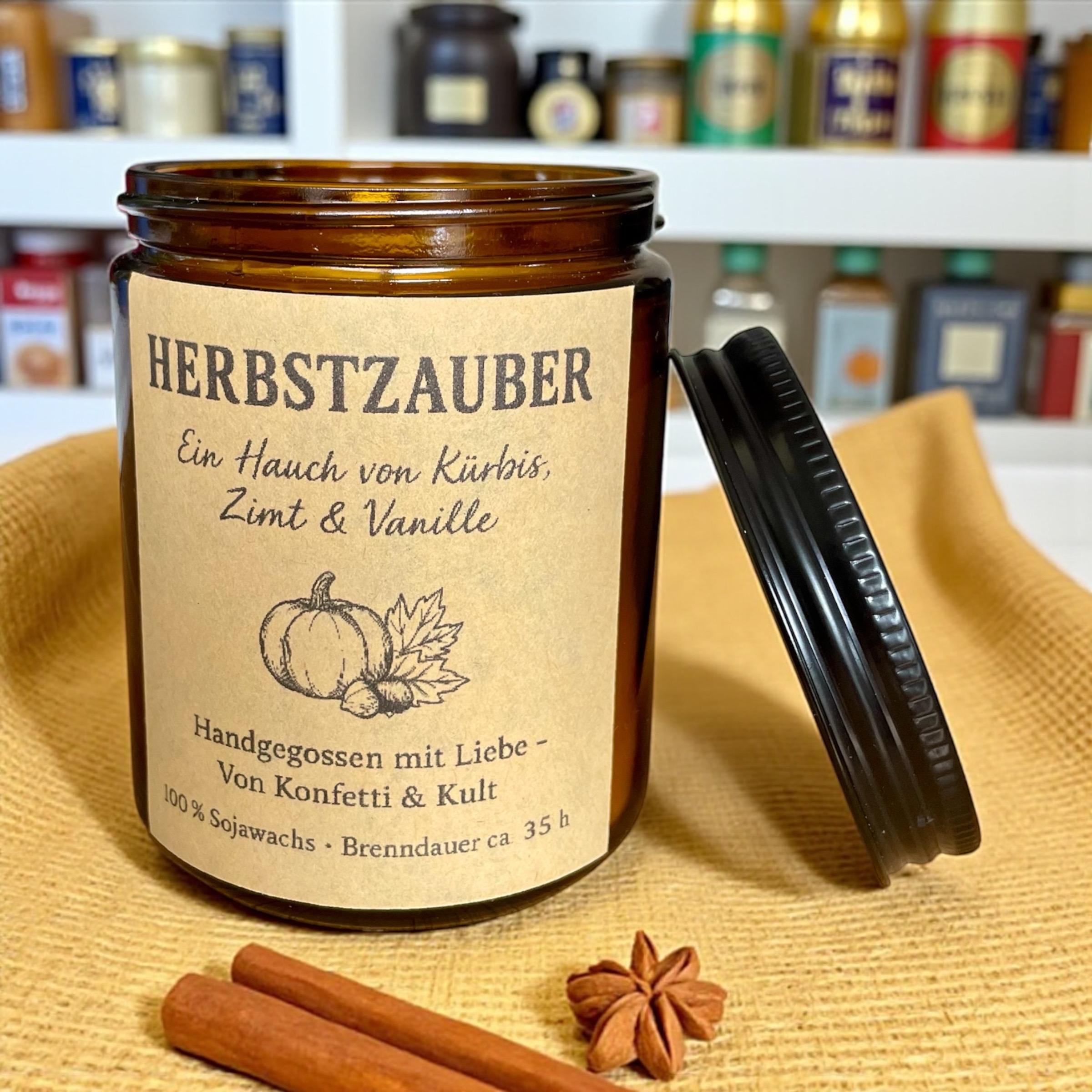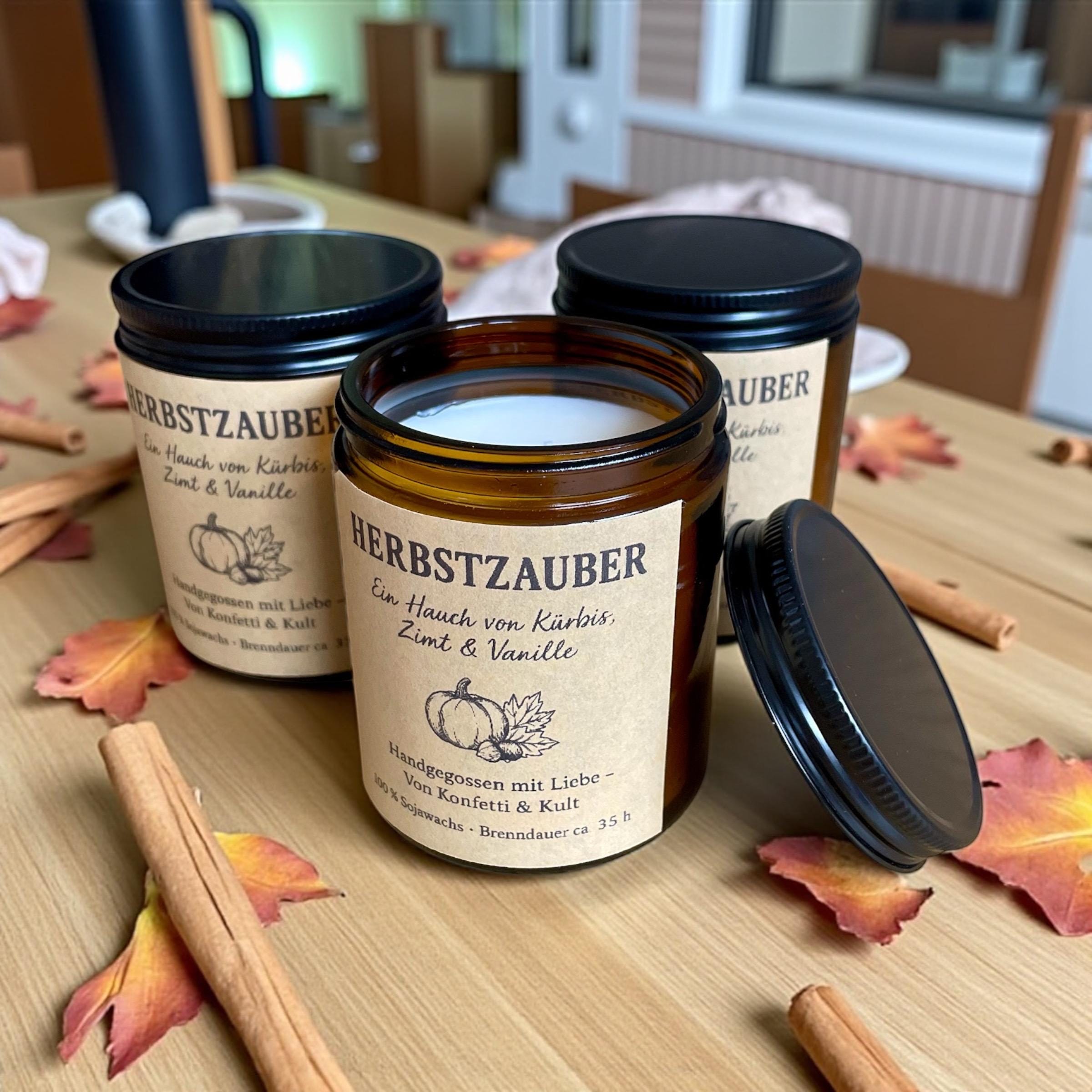 🕯 Product details: • 100% soy wax – natural & vegan • Fragrance: Pumpkin, Cinnamon & Vanilla • Glass: brown glass with black screw cap • Capacity: 240 ml • Burning time: approx. 35 hours • Wick: Cotton, lead-free • Label: Kraft paper with fine illustration • Hand-poured with love – by Konfetti & Kult