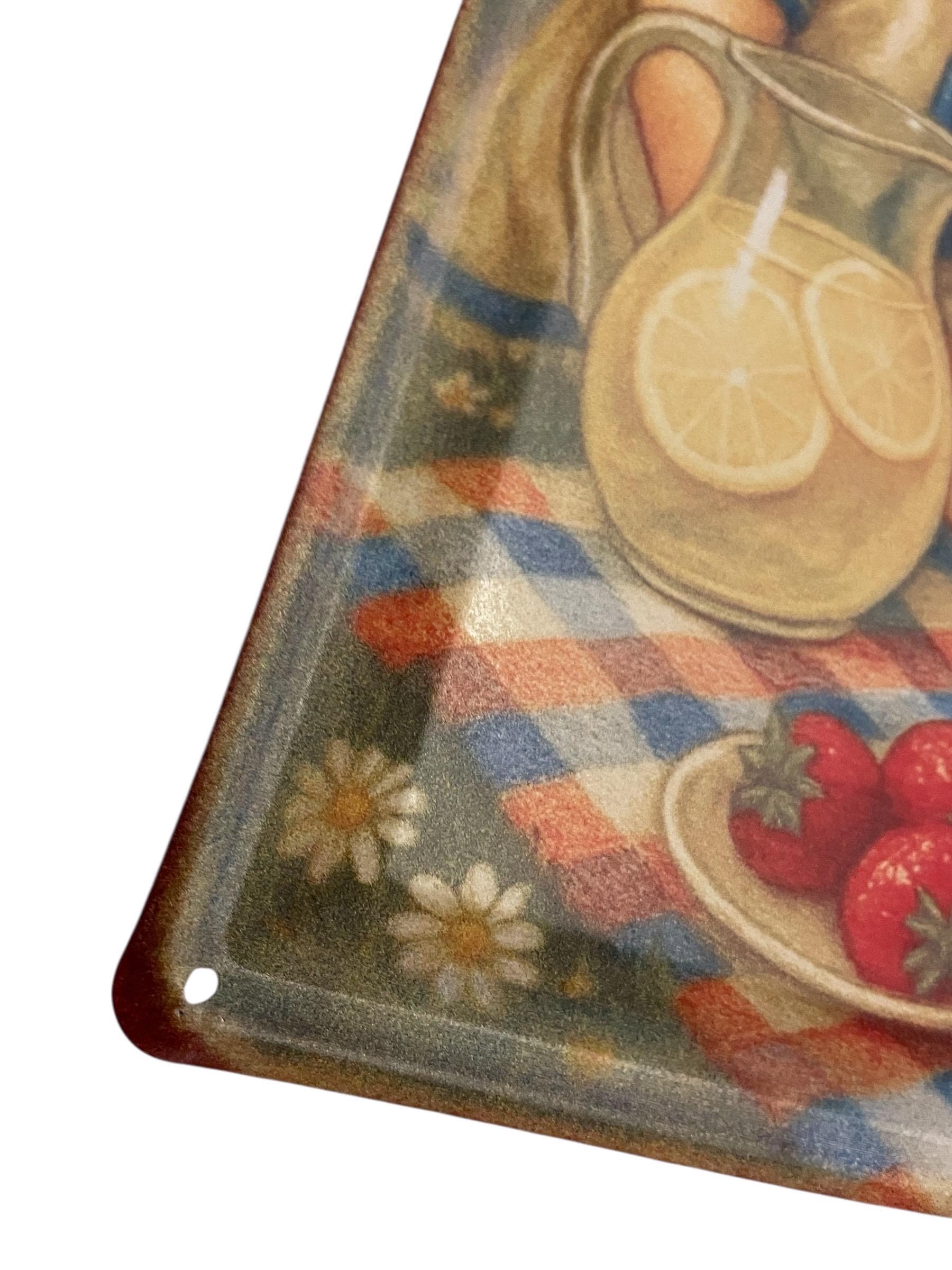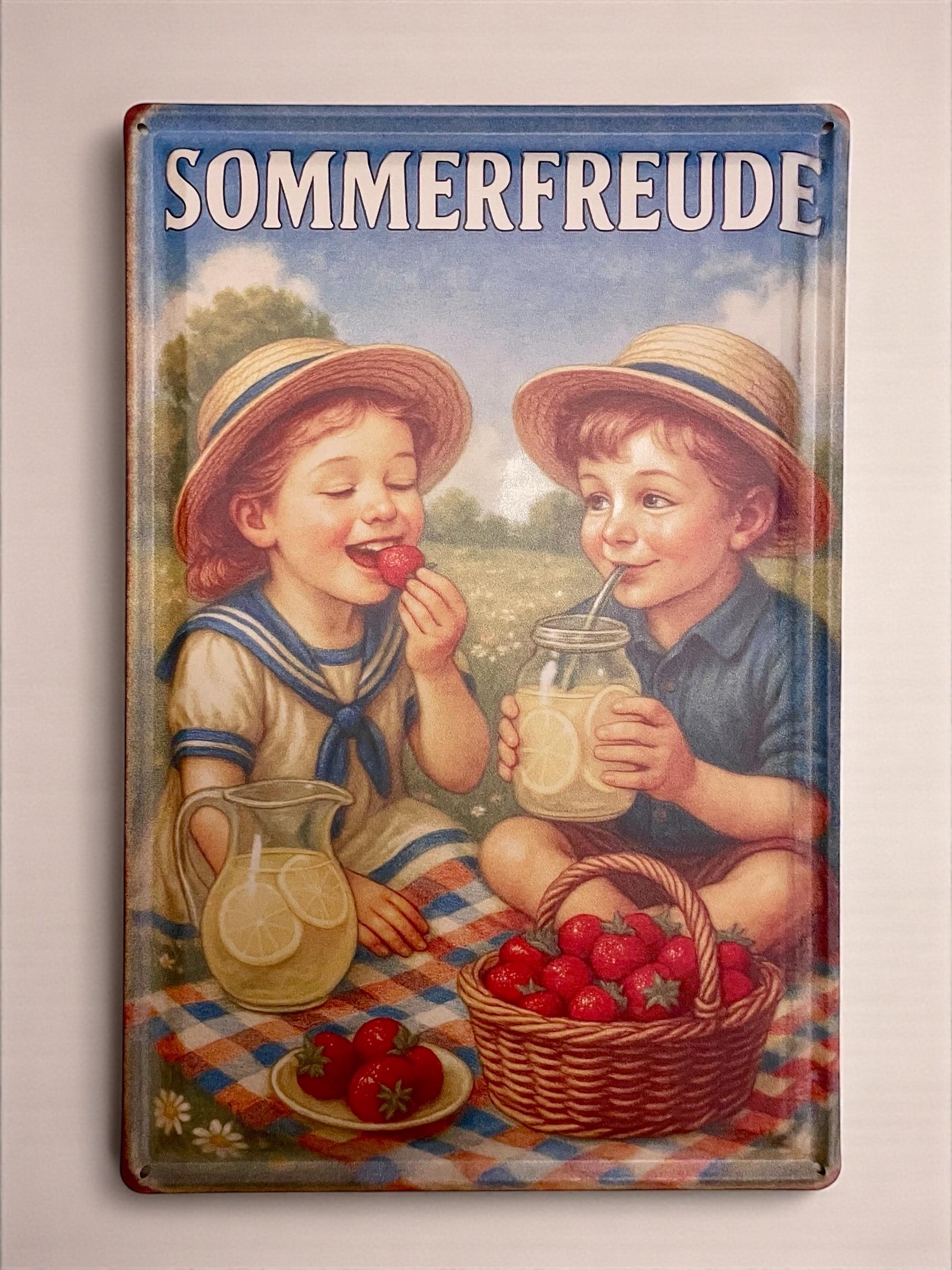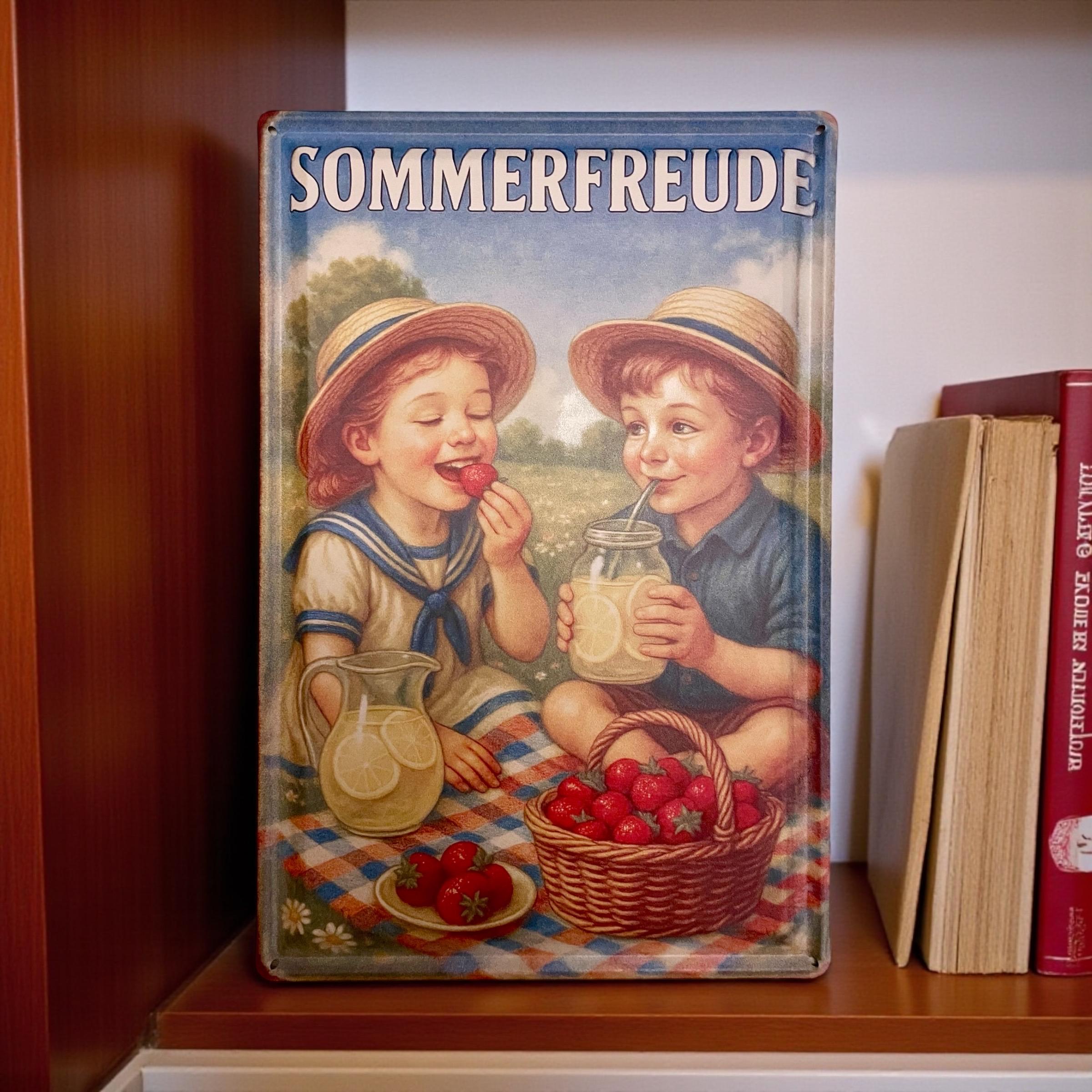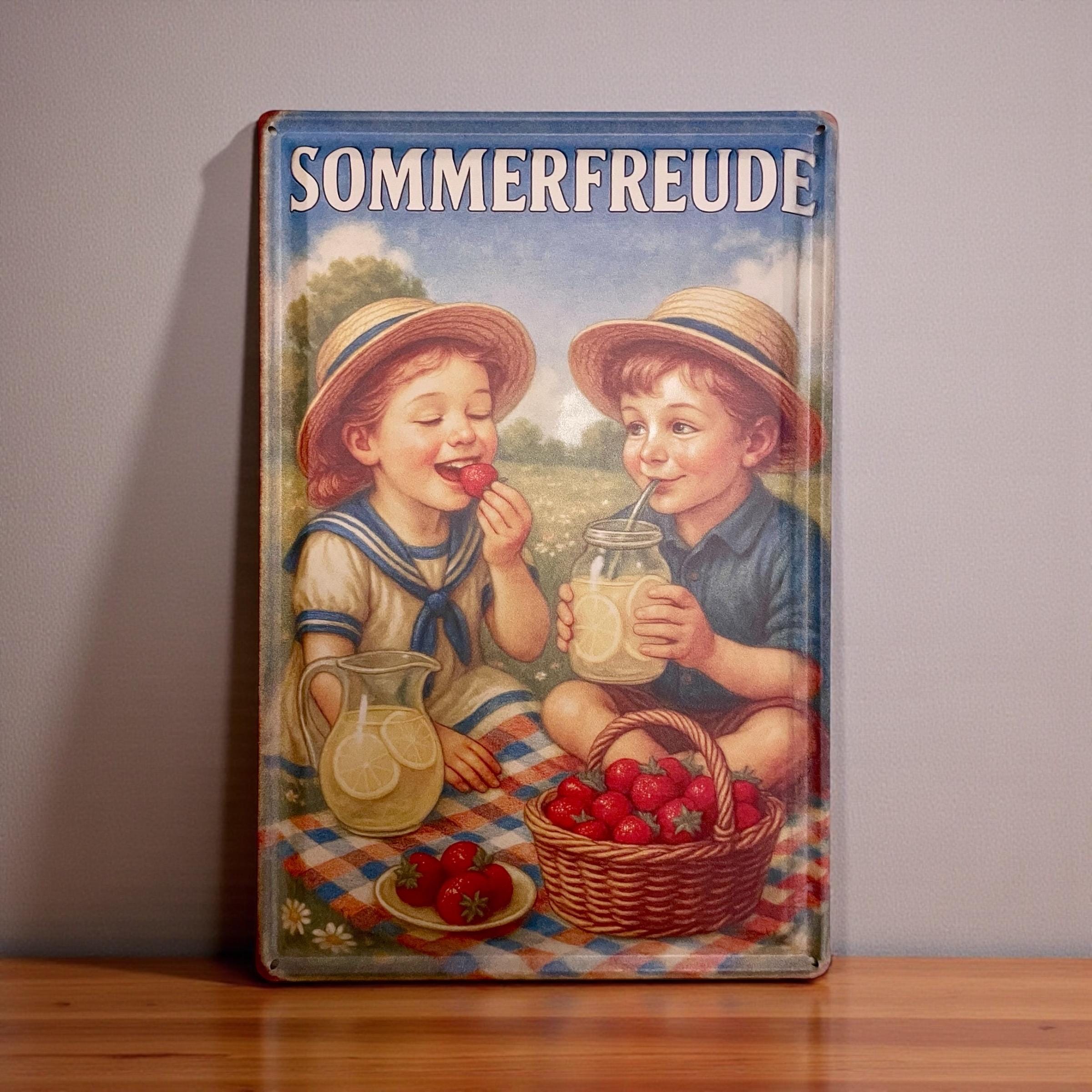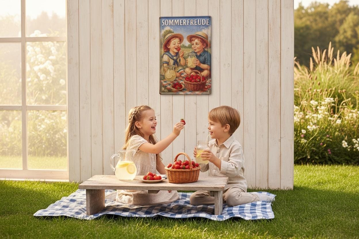 Dieses zauberhafte Nostalgie-Blechschild fängt den Charme eines unbeschwerten Sommertages ein. Das liebevoll illustrierte Motiv zeigt Kinder beim Picknick im Grünen – mit Strohhüten, Erdbeeren und Limonade, umgeben von sanftem Sonnenlicht und Sommerduft.