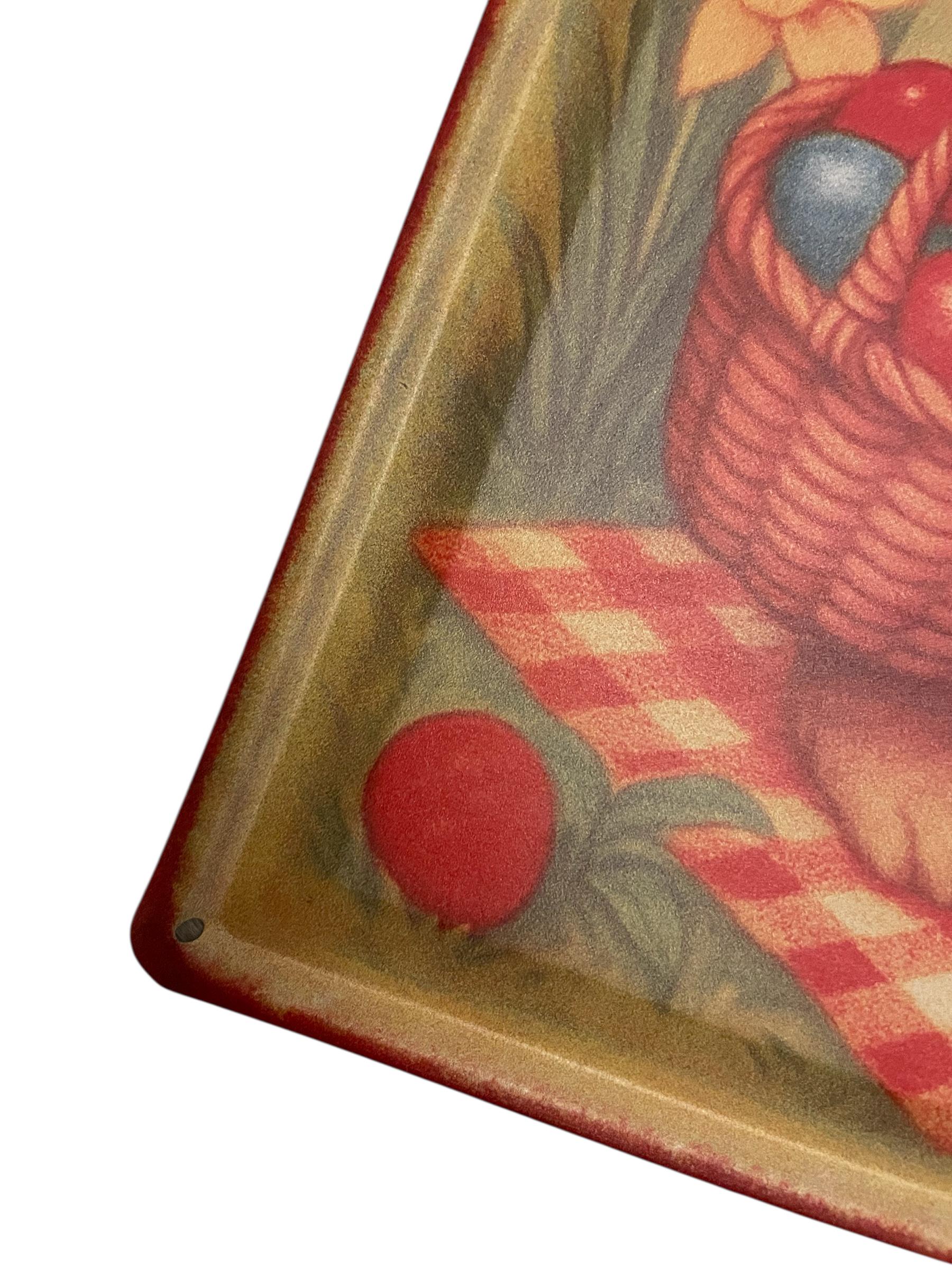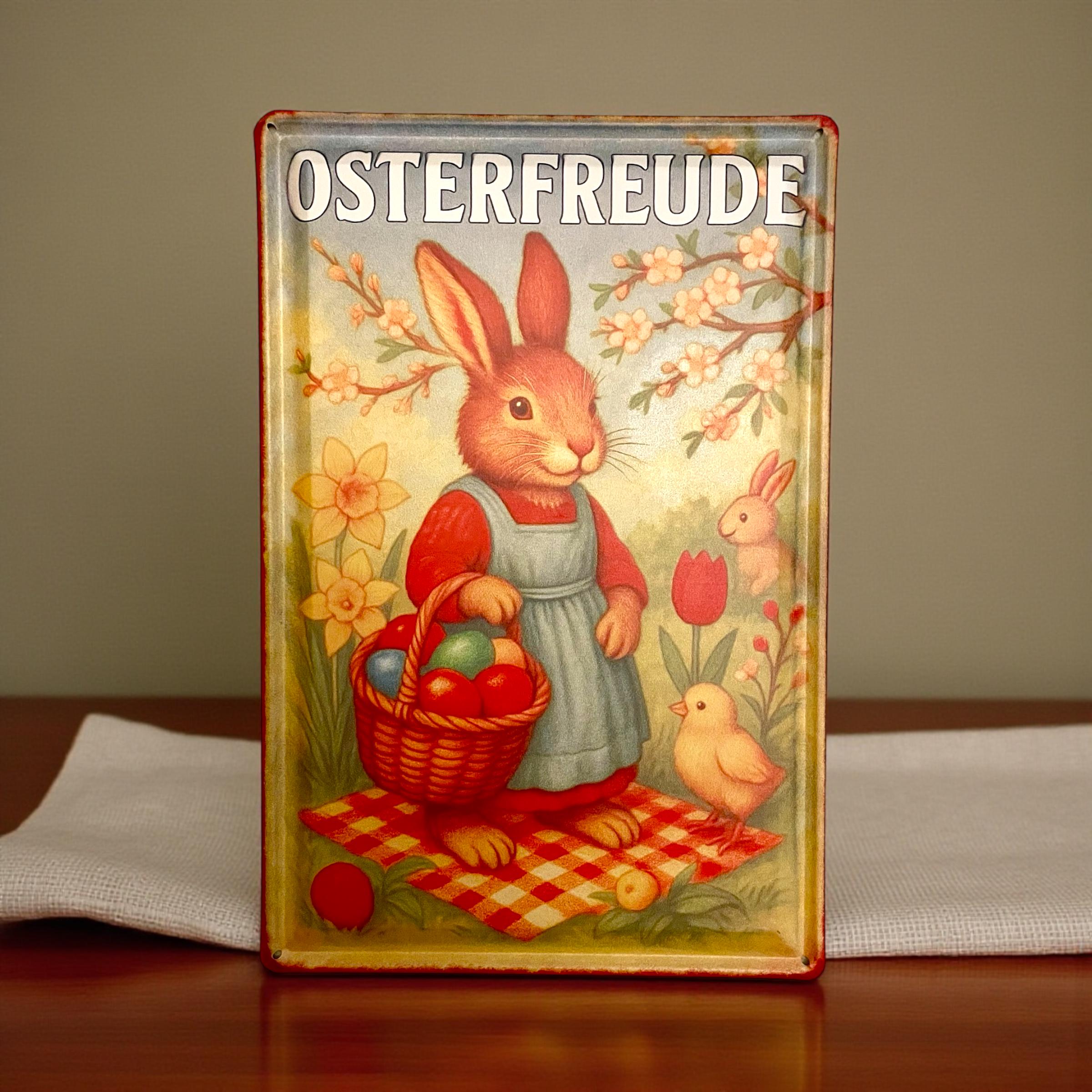 A lovingly designed nostalgic metal sign with a happy bunny girl in a spring garden. The motif is reminiscent of old children's book illustrations and brings a delicate Easter atmosphere into every home. Perfect as a wall decoration, gift or part of a seasonal spring decoration.
