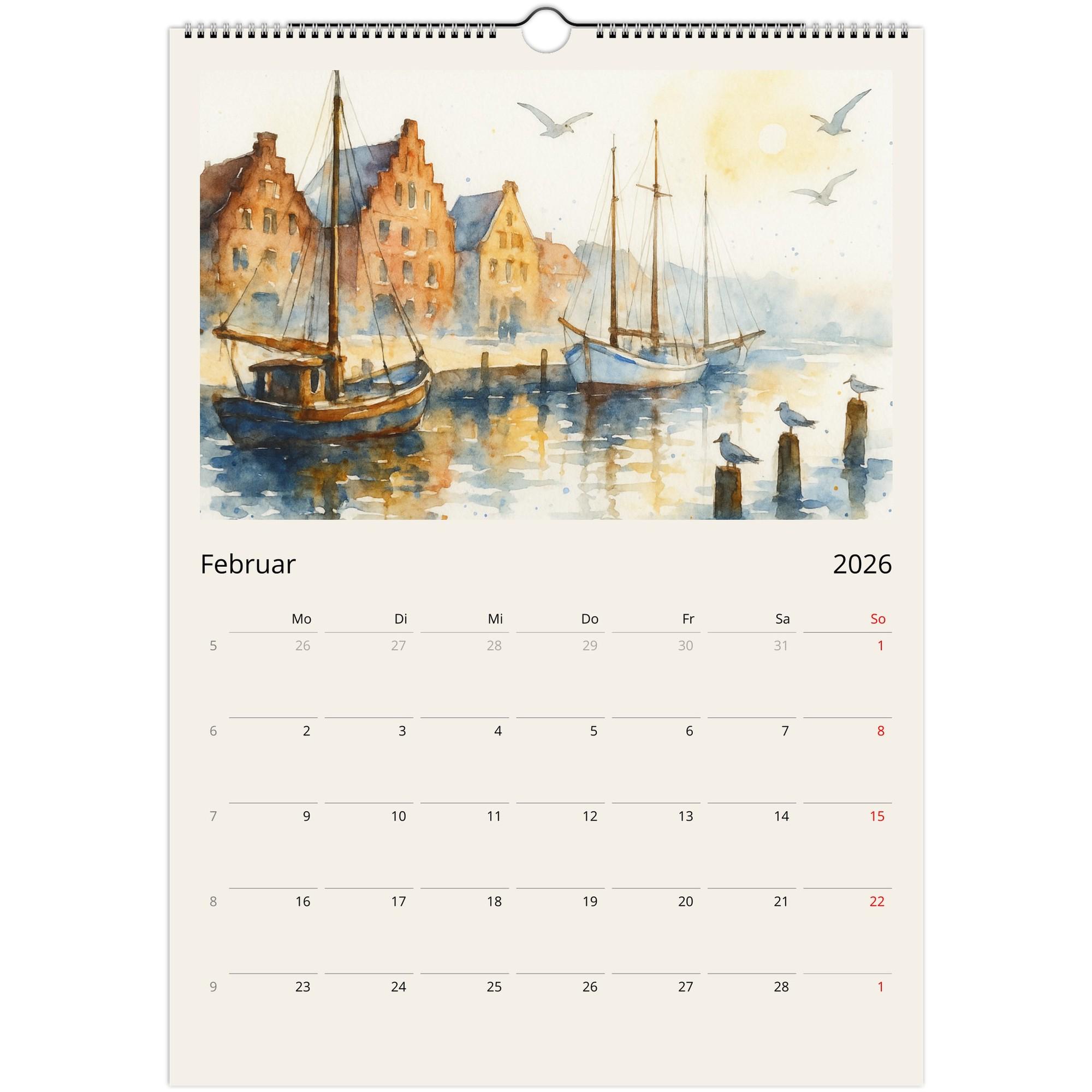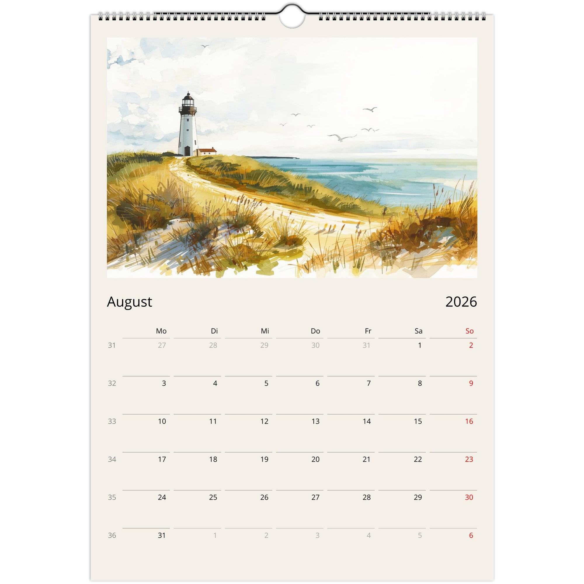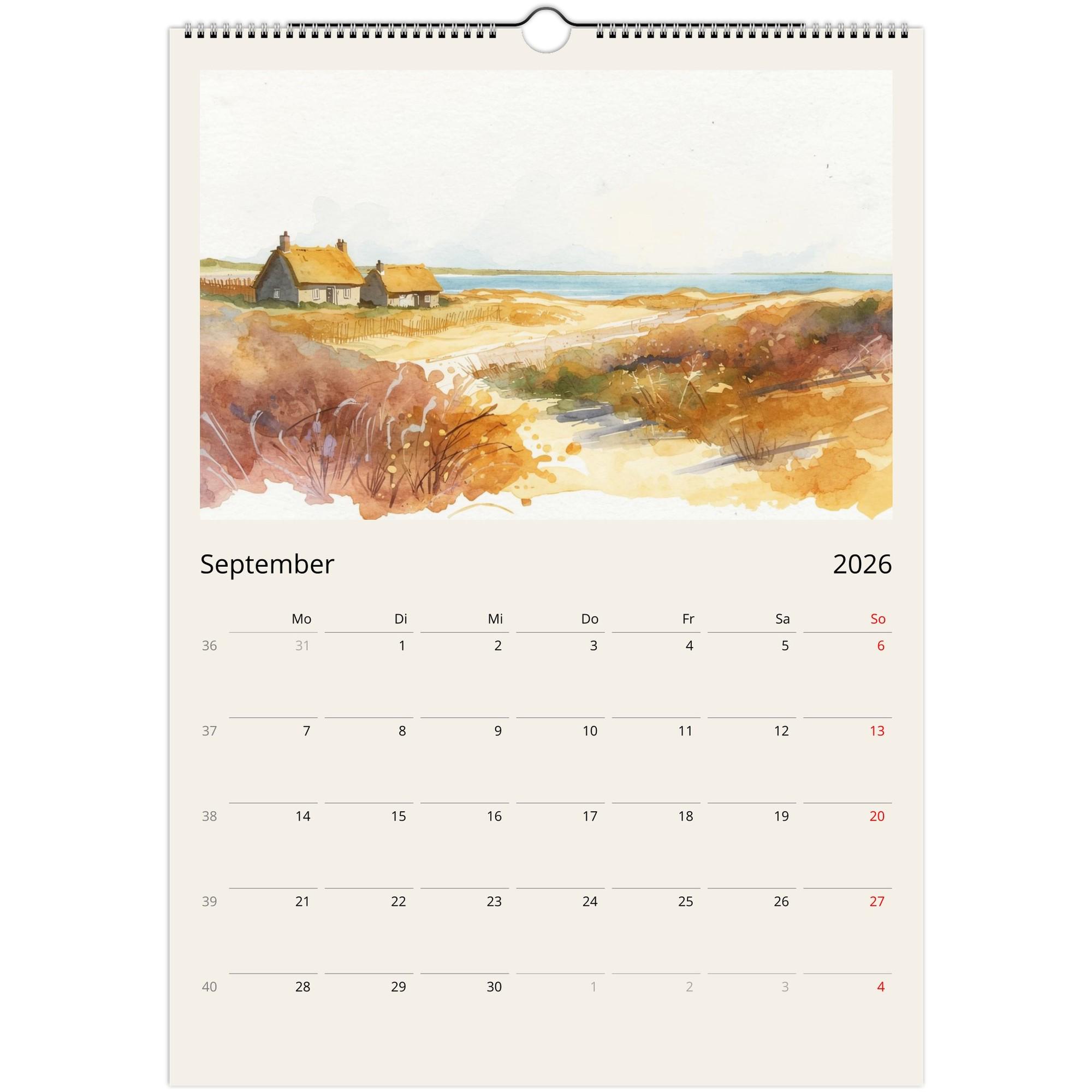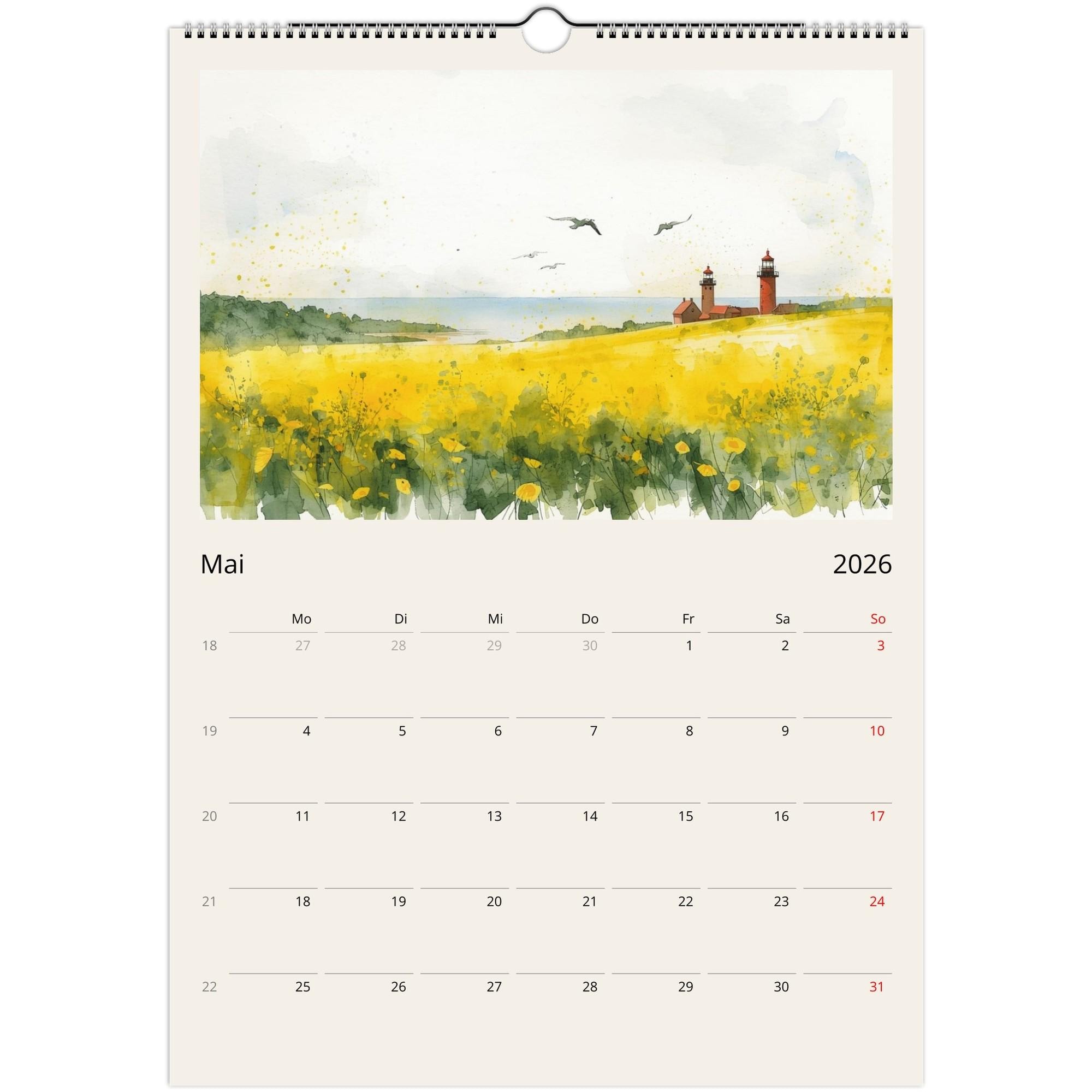 This wall calendar takes you on an atmospheric journey along the Baltic coast – from the quiet winter mornings in Warnemünde to the golden autumn days on the west beach of Zingst. Each monthly page features a lovingly designed watercolor motif, inspired by well-known places in Mecklenburg-Vorpommern: Warnemünde, Stralsund, Wismar, Hiddensee, Rostock, Fischland and many more.